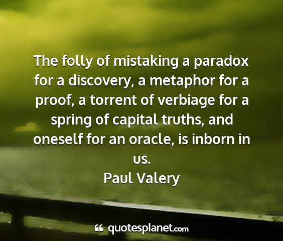 The folly of mistaking a paradox for a discovery, a metaphor for a proof, a torrent of verbiage for a spring of capital truths, and oneself for an oracle, is inborn in us.Paul Valery