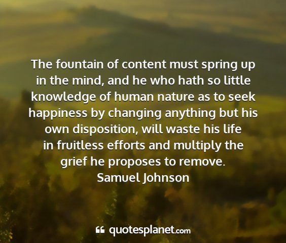 The fountain of content must spring up in the mind, and he who hath so little knowledge of human nature as to seek happiness by changing anything but his own disposition, will waste his life in fruitless efforts and multiply the grief he proposes to remove.Samuel Johnson