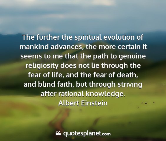 The further the spiritual evolution of mankind advances, the more certain it seems to me that the path to genuine religiosity does not lie through the fear of life, and the fear of death, and blind faith, but through striving after rational knowledge.Albert Einstein