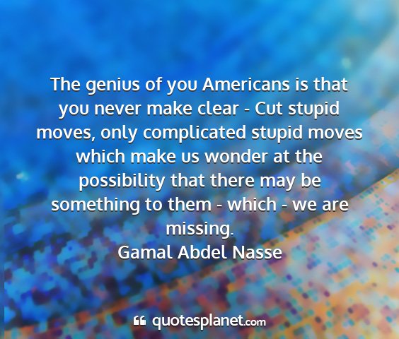 The genius of you Americans is that you never make clear - Cut stupid moves, only complicated stupid moves which make us wonder at the possibility that there may be something to them - which - we are missing.Gamal Abdel Nasse
