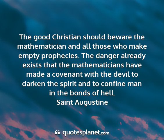 The good Christian should beware the mathematician and all those who make empty prophecies. The danger already exists that the mathematicians have made a covenant with the devil to darken the spirit and to confine man in the bonds of hell.Saint Augustine