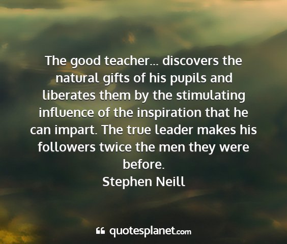 The good teacher... discovers the natural gifts of his pupils and liberates them by the stimulating influence of the inspiration that he can impart. The true leader makes his followers twice the men they were before.Stephen Neill