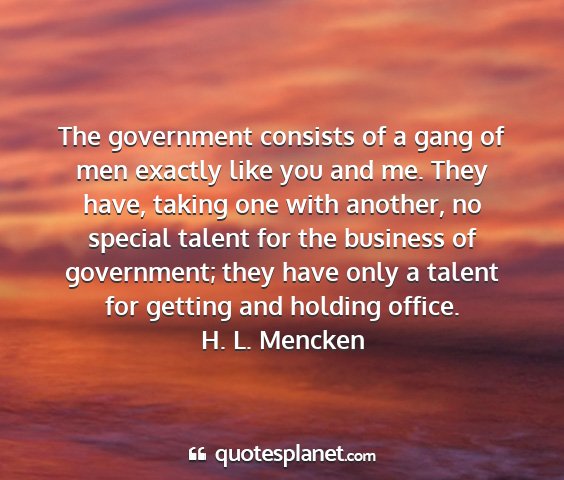 The government consists of a gang of men exactly like you and me. They have, taking one with another, no special talent for the business of government; they have only a talent for getting and holding office.H. L. Mencken