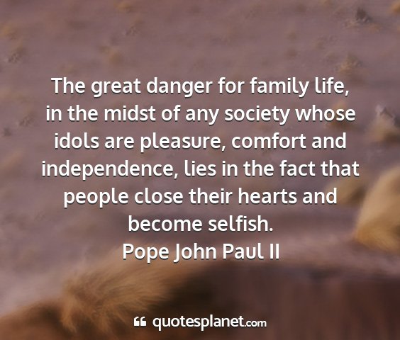 The great danger for family life, in the midst of any society whose idols are pleasure, comfort and independence, lies in the fact that people close their hearts and become selfish.Pope John Paul II