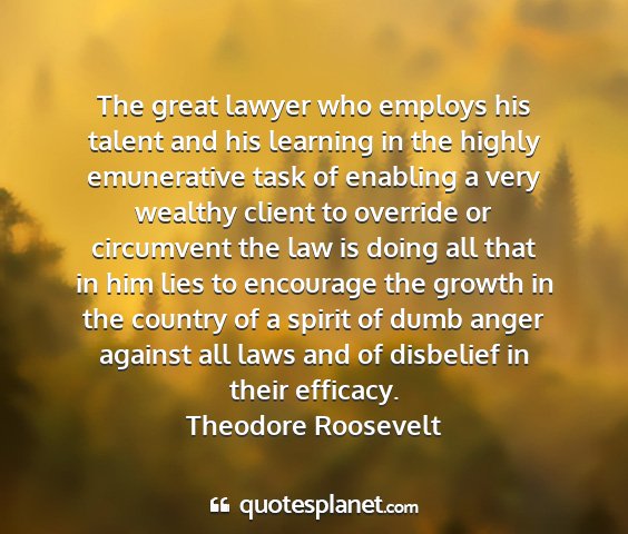 The great lawyer who employs his talent and his learning in the highly emunerative task of enabling a very wealthy client to override or circumvent the law is doing all that in him lies to encourage the growth in the country of a spirit of dumb anger against all laws and of disbelief in their efficacy.Theodore Roosevelt