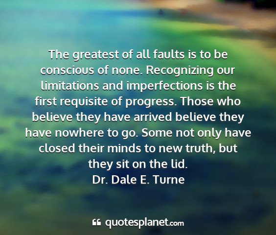 The greatest of all faults is to be conscious of none. Recognizing our limitations and imperfections is the first requisite of progress. Those who believe they have arrived believe they have nowhere to go. Some not only have closed their minds to new truth, but they sit on the lid.Dr. Dale E. Turne