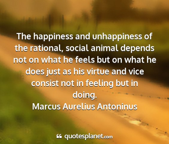 The happiness and unhappiness of the rational, social animal depends not on what he feels but on what he does just as his virtue and vice consist not in feeling but in doing.Marcus Aurelius Antoninus