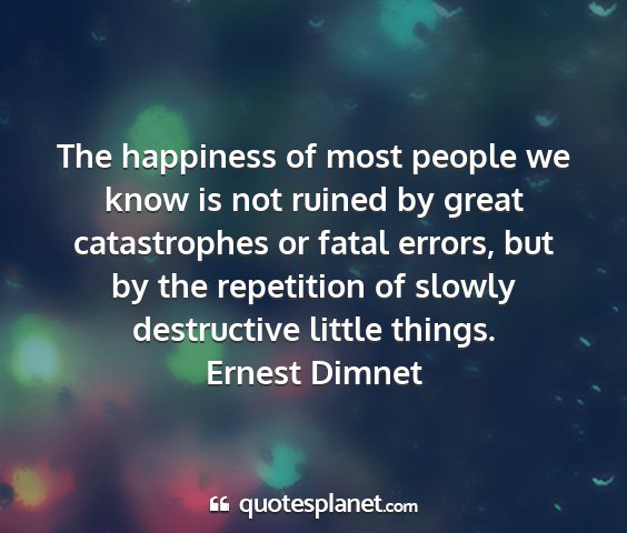 The happiness of most people we know is not ruined by great catastrophes or fatal errors, but by the repetition of slowly destructive little things.Ernest Dimnet