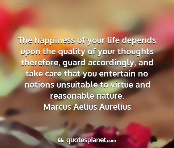 The happiness of your life depends upon the quality of your thoughts therefore, guard accordingly, and take care that you entertain no notions unsuitable to virtue and reasonable nature.Marcus Aelius Aurelius