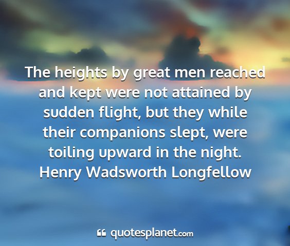 The heights by great men reached and kept were not attained by sudden flight, but they while their companions slept, were toiling upward in the night.Henry Wadsworth Longfellow