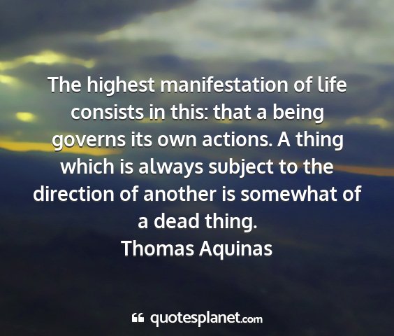 The highest manifestation of life consists in this: that a being governs its own actions. A thing which is always subject to the direction of another is somewhat of a dead thing.Thomas Aquinas
