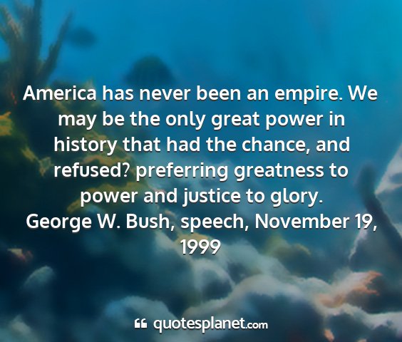 America has never been an empire. We may be the only great power in history that had the chance, and refused? preferring greatness to power and justice to glory.George W. Bush, speech, November 19, 1999
