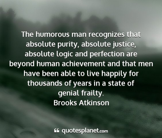 The humorous man recognizes that absolute purity, absolute justice, absolute logic and perfection are beyond human achievement and that men have been able to live happily for thousands of years in a state of genial frailty.Brooks Atkinson