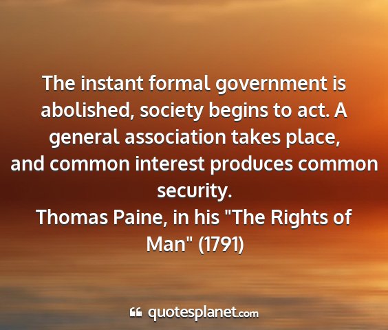 The instant formal government is abolished, society begins to act. A general association takes place, and common interest produces common security.Thomas Paine, in his "The Rights of Man" (1791)