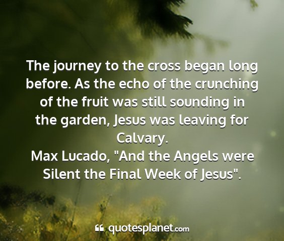 The journey to the cross began long before. As the echo of the crunching of the fruit was still sounding in the garden, Jesus was leaving for Calvary.Max Lucado, "And the Angels were Silent the Final Week of Jesus".