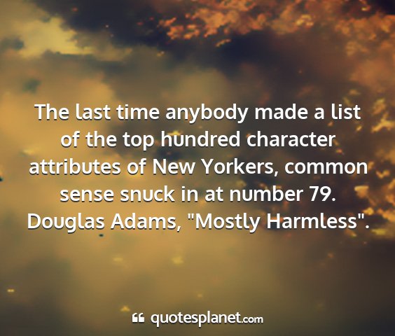The last time anybody made a list of the top hundred character attributes of New Yorkers, common sense snuck in at number 79.Douglas Adams, "Mostly Harmless".