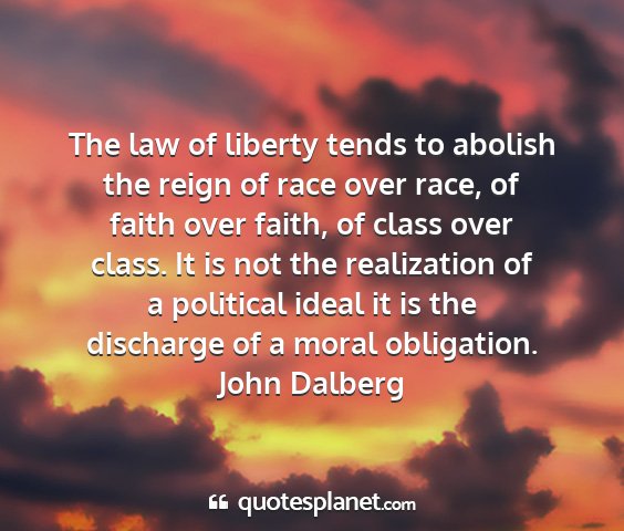 The law of liberty tends to abolish the reign of race over race, of faith over faith, of class over class. It is not the realization of a political ideal it is the discharge of a moral obligation.John Dalberg