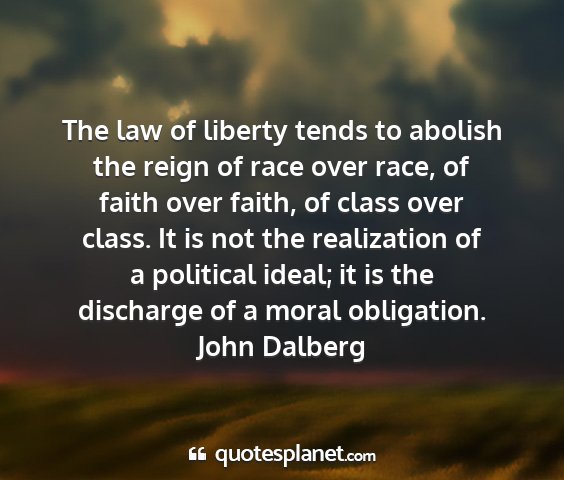 The law of liberty tends to abolish the reign of race over race, of faith over faith, of class over class. It is not the realization of a political ideal; it is the discharge of a moral obligation.John Dalberg