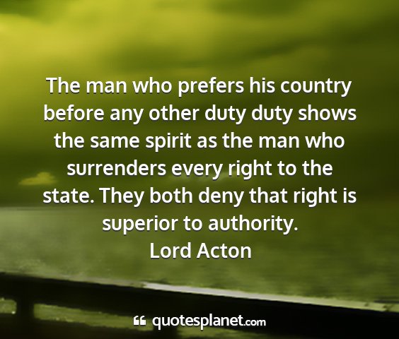 The man who prefers his country before any other duty duty shows the same spirit as the man who surrenders every right to the state. They both deny that right is superior to authority.