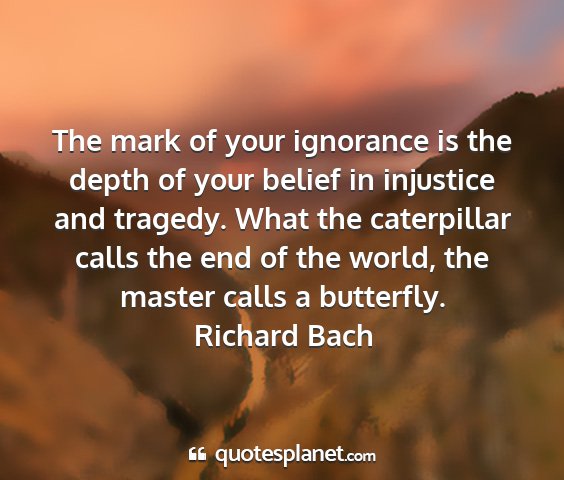 The mark of your ignorance is the depth of your belief in injustice and tragedy. What the caterpillar calls the end of the world, the master calls a butterfly.Richard Bach