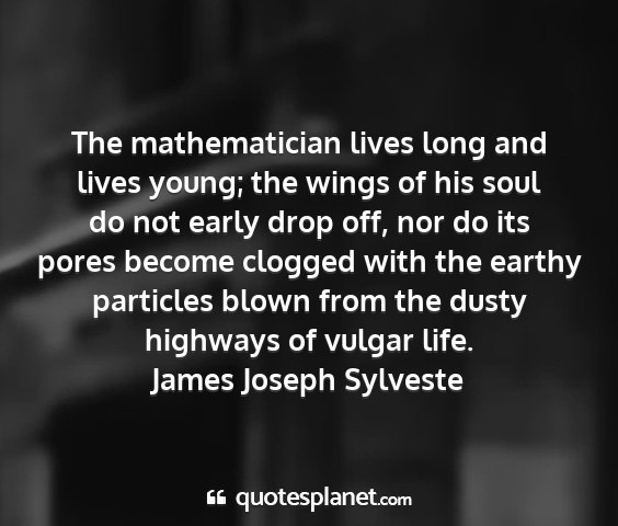 The mathematician lives long and lives young; the wings of his soul do not early drop off, nor do its pores become clogged with the earthy particles blown from the dusty highways of vulgar life.James Joseph Sylveste