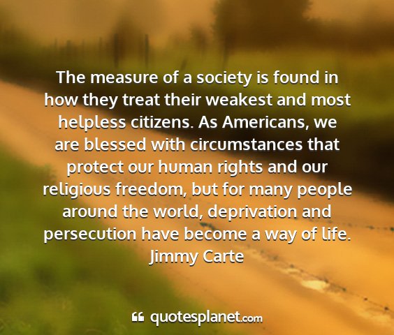 The measure of a society is found in how they treat their weakest and most helpless citizens. As Americans, we are blessed with circumstances that protect our human rights and our religious freedom, but for many people around the world, deprivation and persecution have become a way of life.Jimmy Carte