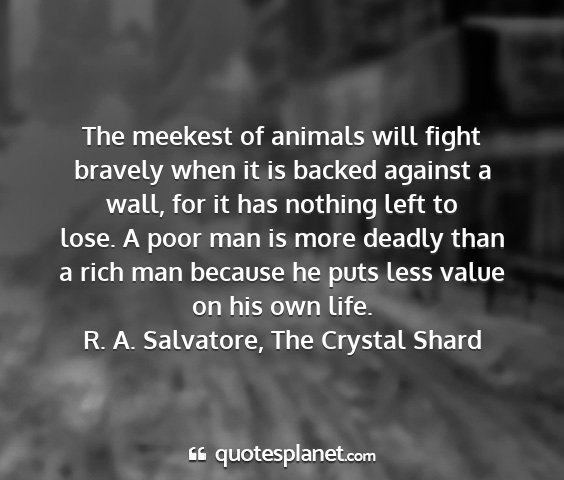 The meekest of animals will fight bravely when it is backed against a wall, for it has nothing left to lose. A poor man is more deadly than a rich man because he puts less value on his own life.R. A. Salvatore, The Crystal Shard