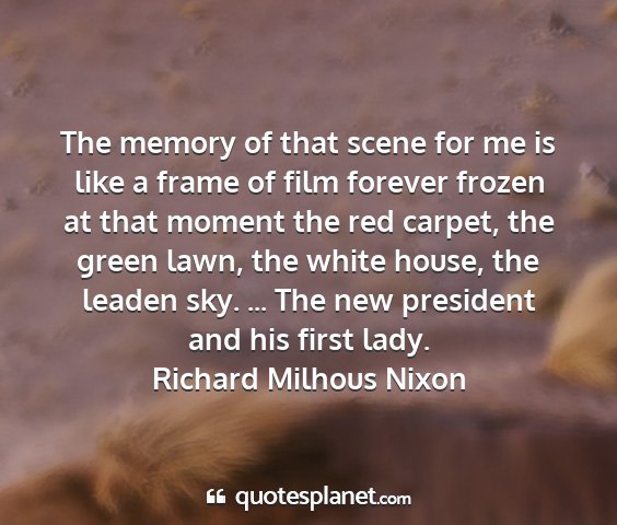 The memory of that scene for me is like a frame of film forever frozen at that moment the red carpet, the green lawn, the white house, the leaden sky. ... The new president and his first lady.Richard Milhous Nixon