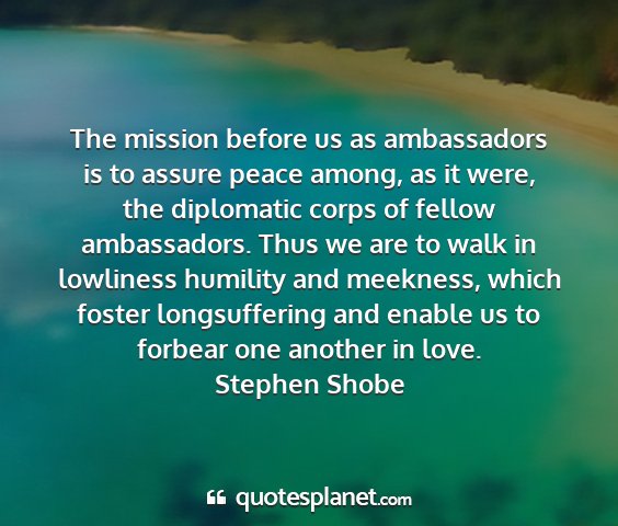 The mission before us as ambassadors is to assure peace among, as it were, the diplomatic corps of fellow ambassadors. Thus we are to walk in lowliness humility and meekness, which foster longsuffering and enable us to forbear one another in love.Stephen Shobe