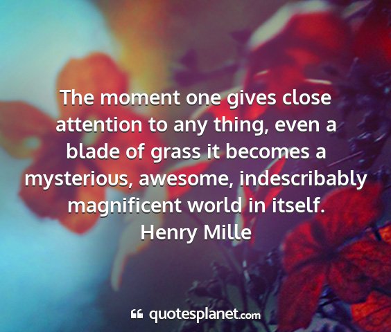 The moment one gives close attention to any thing, even a blade of grass it becomes a mysterious, awesome, indescribably magnificent world in itself.Henry Mille