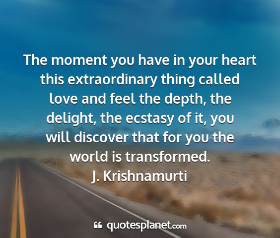 The moment you have in your heart this extraordinary thing called love and feel the depth, the delight, the ecstasy of it, you will discover that for you the world is transformed.J. Krishnamurti