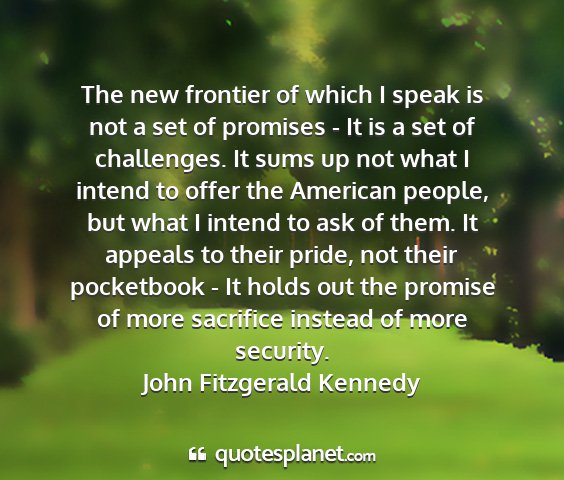 The new frontier of which I speak is not a set of promises - It is a set of challenges. It sums up not what I intend to offer the American people, but what I intend to ask of them. It appeals to their pride, not their pocketbook - It holds out the promise of more sacrifice instead of more security.John Fitzgerald Kennedy
