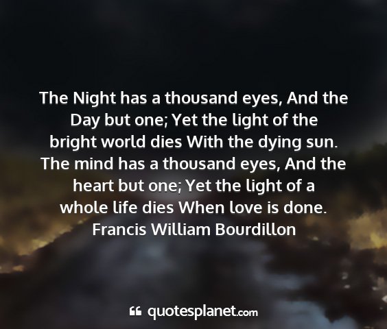 The Night has a thousand eyes, And the Day but one; Yet the light of the bright world dies With the dying sun. The mind has a thousand eyes, And the heart but one; Yet the light of a whole life dies When love is done.Francis William Bourdillon