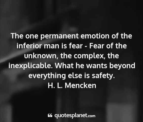 The one permanent emotion of the inferior man is fear - Fear of the unknown, the complex, the inexplicable. What he wants beyond everything else is safety.H. L. Mencken