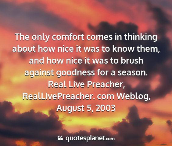 The only comfort comes in thinking about how nice it was to know them, and how nice it was to brush against goodness for a season.Real Live Preacher, RealLivePreacher. com Weblog, August 5, 2003