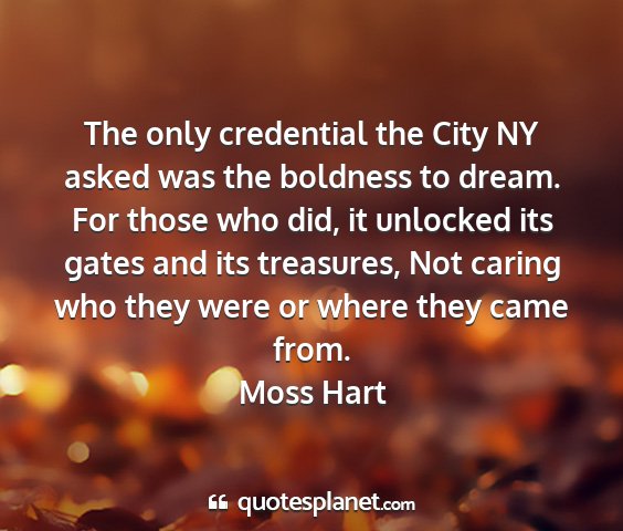 The only credential the City NY asked was the boldness to dream. For those who did, it unlocked its gates and its treasures, Not caring who they were or where they came from.Moss Hart