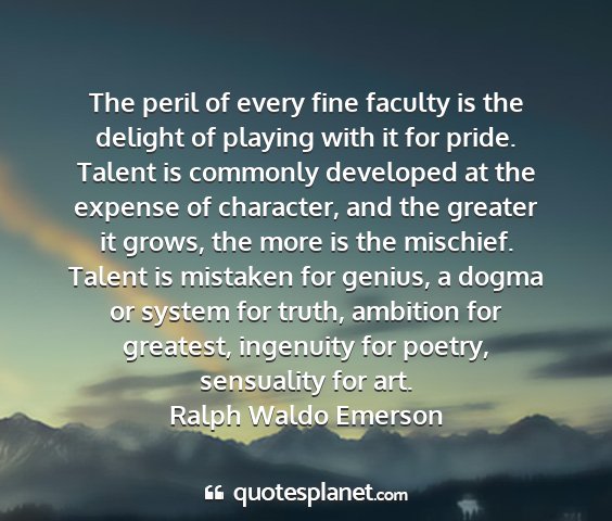 The peril of every fine faculty is the delight of playing with it for pride. Talent is commonly developed at the expense of character, and the greater it grows, the more is the mischief. Talent is mistaken for genius, a dogma or system for truth, ambition for greatest, ingenuity for poetry, sensuality for art.Ralph Waldo Emerson
