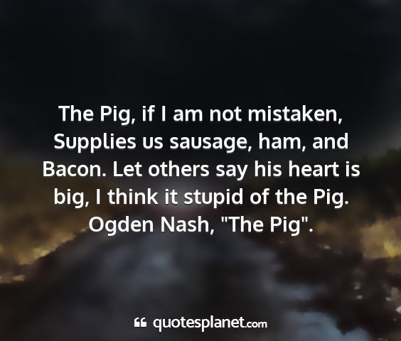 The Pig, if I am not mistaken, Supplies us sausage, ham, and Bacon. Let others say his heart is big, I think it stupid of the Pig.Ogden Nash, "The Pig".