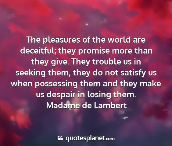 The pleasures of the world are deceitful; they promise more than they give. They trouble us in seeking them, they do not satisfy us when possessing them and they make us despair in losing them.Madame de Lambert