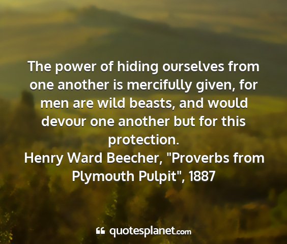 The power of hiding ourselves from one another is mercifully given, for men are wild beasts, and would devour one another but for this protection.Henry Ward Beecher, "Proverbs from Plymouth Pulpit", 1887