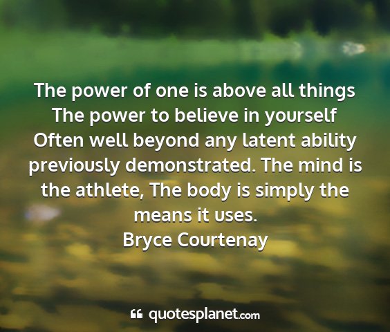 The power of one is above all things The power to believe in yourself Often well beyond any latent ability previously demonstrated. The mind is the athlete, The body is simply the means it uses.Bryce Courtenay