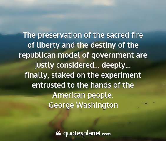 The preservation of the sacred fire of liberty and the destiny of the republican model of government are justly considered... deeply... finally, staked on the experiment entrusted to the hands of the American people.George Washington