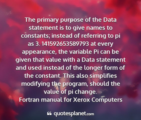 The primary purpose of the Data statement is to give names to constants; instead of referring to pi as 3. 141592653589793 at every appearance, the variable Pi can be given that value with a Data statement and used instead of the longer form of the constant. This also simplifies modifying the program, should the value of pi change.Fortran manual for Xerox Computers