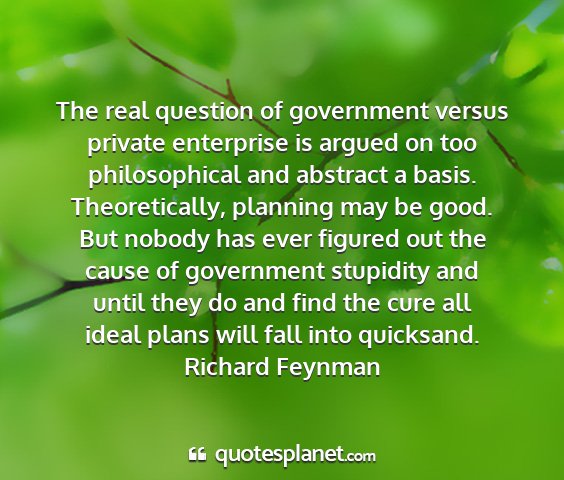 The real question of government versus private enterprise is argued on too philosophical and abstract a basis. Theoretically, planning may be good. But nobody has ever figured out the cause of government stupidity and until they do and find the cure all ideal plans will fall into quicksand.Richard Feynman