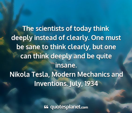 The scientists of today think deeply instead of clearly. One must be sane to think clearly, but one can think deeply and be quite insane.Nikola Tesla, Modern Mechanics and Inventions. July, 1934