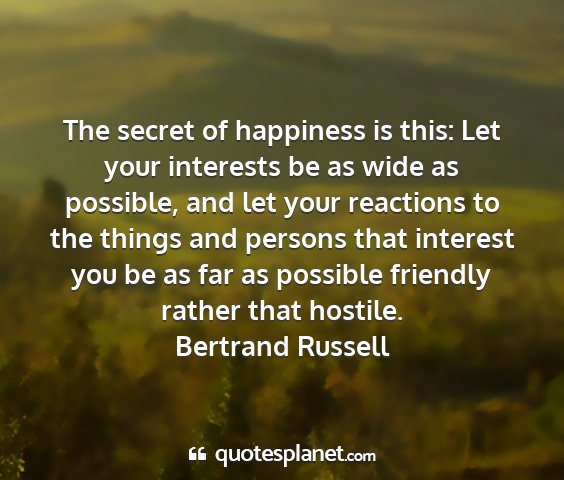 The secret of happiness is this: Let your interests be as wide as possible, and let your reactions to the things and persons that interest you be as far as possible friendly rather that hostile.Bertrand Russell