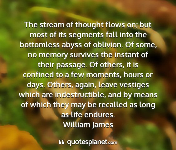 The stream of thought flows on; but most of its segments fall into the bottomless abyss of oblivion. Of some, no memory survives the instant of their passage. Of others, it is confined to a few moments, hours or days. Others, again, leave vestiges which are indestructible, and by means of which they may be recalled as long as life endures.William James