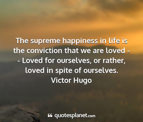 The supreme happiness in life is the conviction that we are loved - - Loved for ourselves, or rather, loved in spite of ourselves.Victor Hugo
