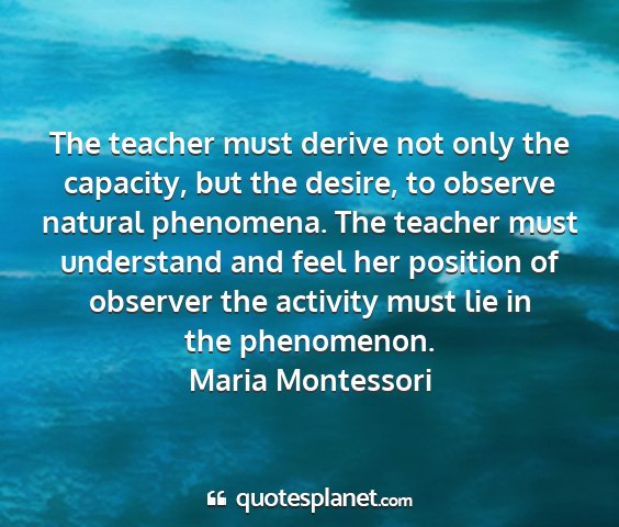 The teacher must derive not only the capacity, but the desire, to observe natural phenomena. The teacher must understand and feel her position of observer the activity must lie in the phenomenon.Maria Montessori