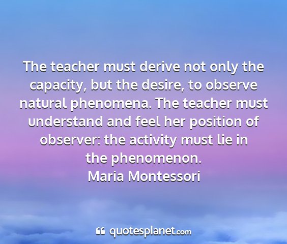 The teacher must derive not only the capacity, but the desire, to observe natural phenomena. The teacher must understand and feel her position of observer: the activity must lie in the phenomenon.Maria Montessori